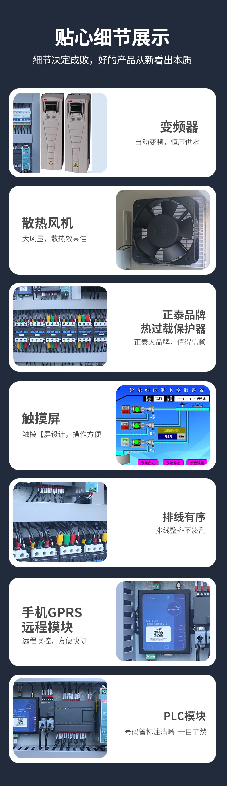 支持多種控制模式(如液位、壓力、溫度、時間控制),具備自動巡檢、故障記憶、遠程監(jiān)控、定時換泵、小流量休眠等功能,減少人工干預(yù),實現(xiàn)無人值守 。