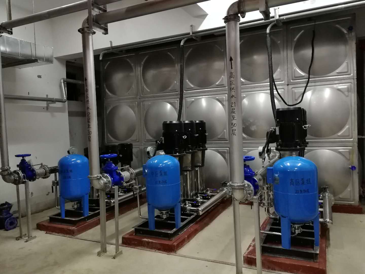 甕安縣公安局新建看守所采用兩用一備恒壓設(shè)備帶水箱,設(shè)備流量設(shè)計(jì)為每小時(shí)四十立方,揚(yáng)程五十八米,足夠七八百人每天的常用水量。由于地處比較偏遠(yuǎn)地區(qū),考慮到水壓不夠穩(wěn)定的情況,設(shè)計(jì)了長(zhǎng)6米,寬5米,高3米的304不銹鋼水箱,以作為水源補(bǔ)充。